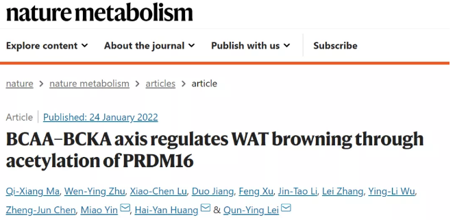 2022年1月24日,復旦大學雷群英、黃海艷和尹淼聯(lián)合在Nature Metabolism雜志發(fā)表了題為BCAA–BCKA axis regulates WAT browning through acetylation of PRDM16 研究文章,作者發(fā)現(xiàn)BCAT2(白色脂肪中代謝BCAA的關鍵酶)全脂肪特異敲除小鼠以及白色脂肪特異敲除小鼠能抵抗高脂誘導的肥胖,深入研究發(fā)現(xiàn)脂肪組織中敲除BCAT2減少了BCAA來源的Ac-CoA,造成Prdm16乙酰化水平下降,從而增強轉(zhuǎn)錄因子Prdm16和Pparγ相互作用,促進了白色脂肪棕色化。進一步藥物篩選發(fā)現(xiàn)替米沙坦直接結合BCAT2來抑制BCAA代謝,從而抵抗高脂誘導的小鼠肥胖,為臨床藥物治療肥胖提供了思路。