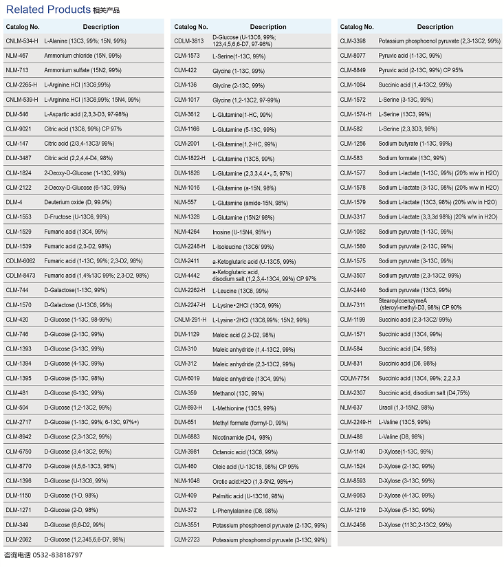 同位素示蹤劑是代謝研究中重要的工具。為了測定培養(yǎng)哺乳動物細(xì)胞內(nèi)中心碳代謝途徑代謝通量,我們向動物細(xì)胞培養(yǎng)基中添加D -葡萄糖(13C6, 99%) (CLM-1396)或L -谷氨酰胺(13C5, 99%) (CLM-1822)。細(xì)胞通過在同位素標(biāo)記的培養(yǎng)基中進(jìn)行培養(yǎng),其代謝物可以通過用GC / MS或LC / MS進(jìn)行檢測。在傳統(tǒng)研究中,葡萄糖通常被認(rèn)為是許多細(xì)胞,特別是癌細(xì)胞的主要碳源。然而,最近的研究表明,谷氨酰胺通常在三羧酸(TCA)循環(huán)中起主導(dǎo)作用。谷氨酰胺對三羧酸循環(huán)中四碳化合物的作用,可以通過對蘋果酸鹽和天門冬氨酸標(biāo)記來檢測,而對三羧酸循環(huán)中二碳化合物的作用可以通過乙酰輔酶A和脂肪酸標(biāo)記來檢測。檸檬酸是一種信息非常豐富的分子,在三羧酸循環(huán)中它對二碳化合物以及四碳化合物都有相關(guān)作用。使用質(zhì)譜等現(xiàn)代化的儀器,可以同時測量所有這些所有同位素標(biāo)記的化合物,從而實(shí)現(xiàn)系統(tǒng)級通量定量。這些方法也可以應(yīng)用于生物體內(nèi)環(huán)境,在切除腫瘤或其他組織標(biāo)本之前,給小鼠或患者注入同位素標(biāo)記的營養(yǎng)素。代謝在生物工程和疾病病理生理學(xué)中具有非??傄囊馑?,也使得同位素在生物化學(xué)科學(xué)中的得到越來越廣泛應(yīng)用。