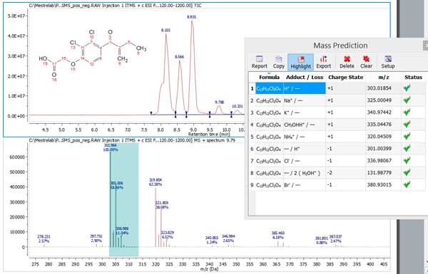 該功能允許用戶提出一個或多個分子式,并使用所有預定義的加合物/損失列表預測其質(zhì)量峰;Mnova MS預測列表中的分子離子峰和同位素峰,并自動將預測峰與實驗峰(如果可用)進行匹配;用戶可以選擇在光譜上顯示哪種預測(具有所需加合物或損失)以進行比較。