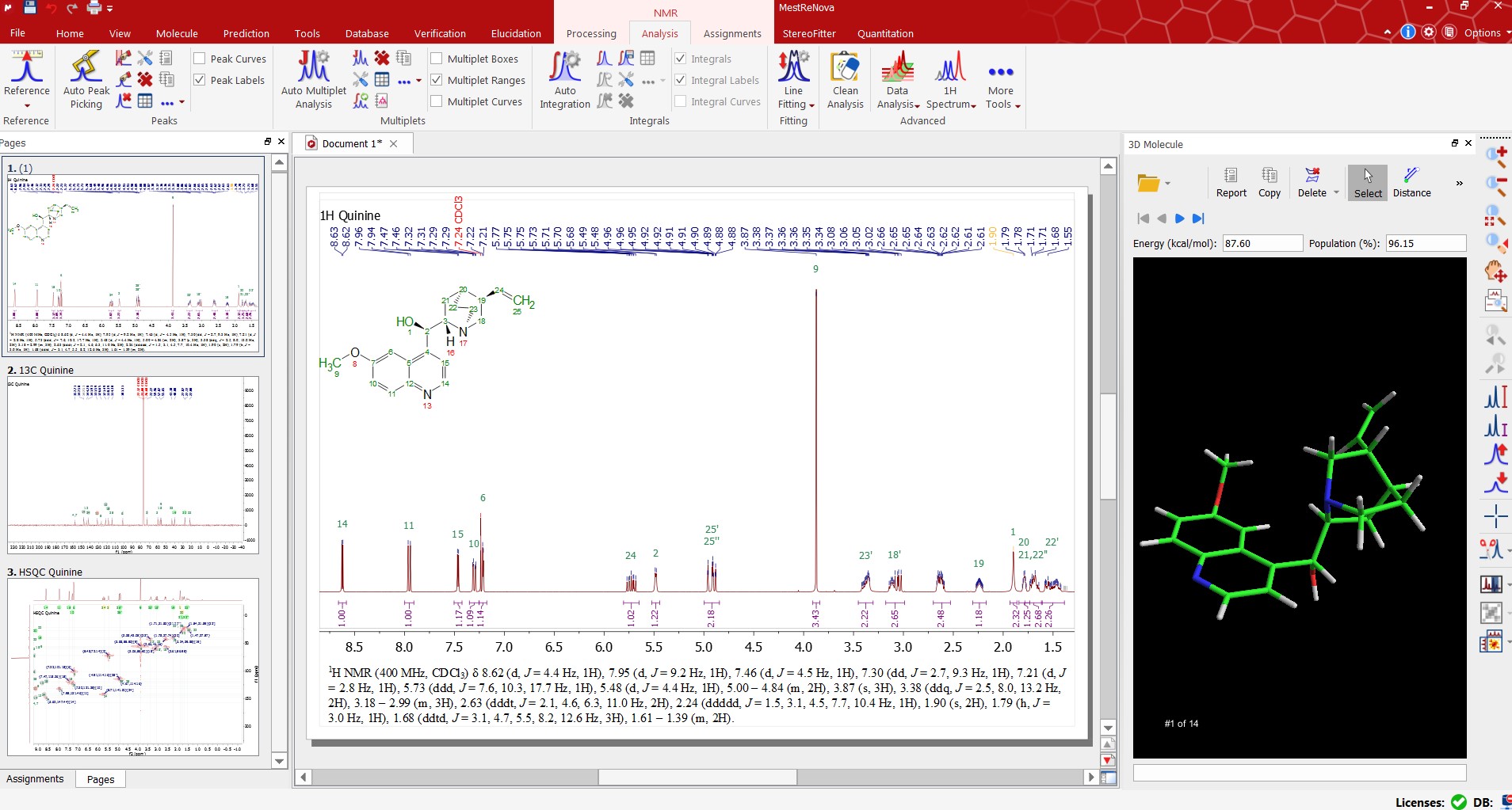 自動譜圖分析從未如此強大。我們的自動分析執(zhí)行全譜去卷積 (GSD)(包括分辨率增強步驟)以分離所有可用信號。然后,軟件對特定類別(化合物、雜質、13C衛(wèi)星、溶劑等)內的每個單獨峰進行表征和標記,并在完成該步驟后,分析化合物信號,將其分組為相關多重峰,進行積分、標記等。全自動的過程將使您在分析譜圖時得到理想的結果,并且,如果您想要優(yōu)化分析,Mnova在每個步驟都具有交互控制。
