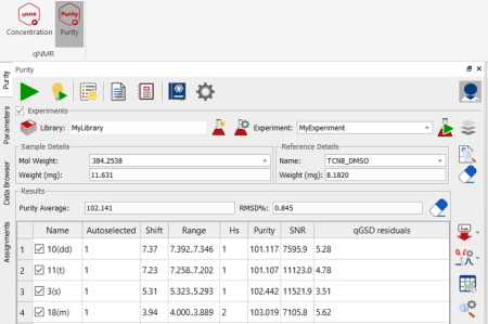 此模塊使用Concentration “engine”,因此具有其所有功能。此功能可以使核磁共振“Purity” (a.k.a. “Potency”)測量簡單而準(zhǔn)確。同時(shí),相同的基本功能可用于測量鹽比和溶劑污染水平。
