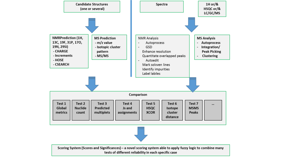 ♠ 為提出的結(jié)構(gòu)生成預(yù)測(cè)數(shù)據(jù)(1H、13C、HSQC譜圖預(yù)測(cè)—Mnova NMRPredict. 質(zhì)量電荷數(shù)、同位素簇、碎片和MS/MS預(yù)測(cè))。
